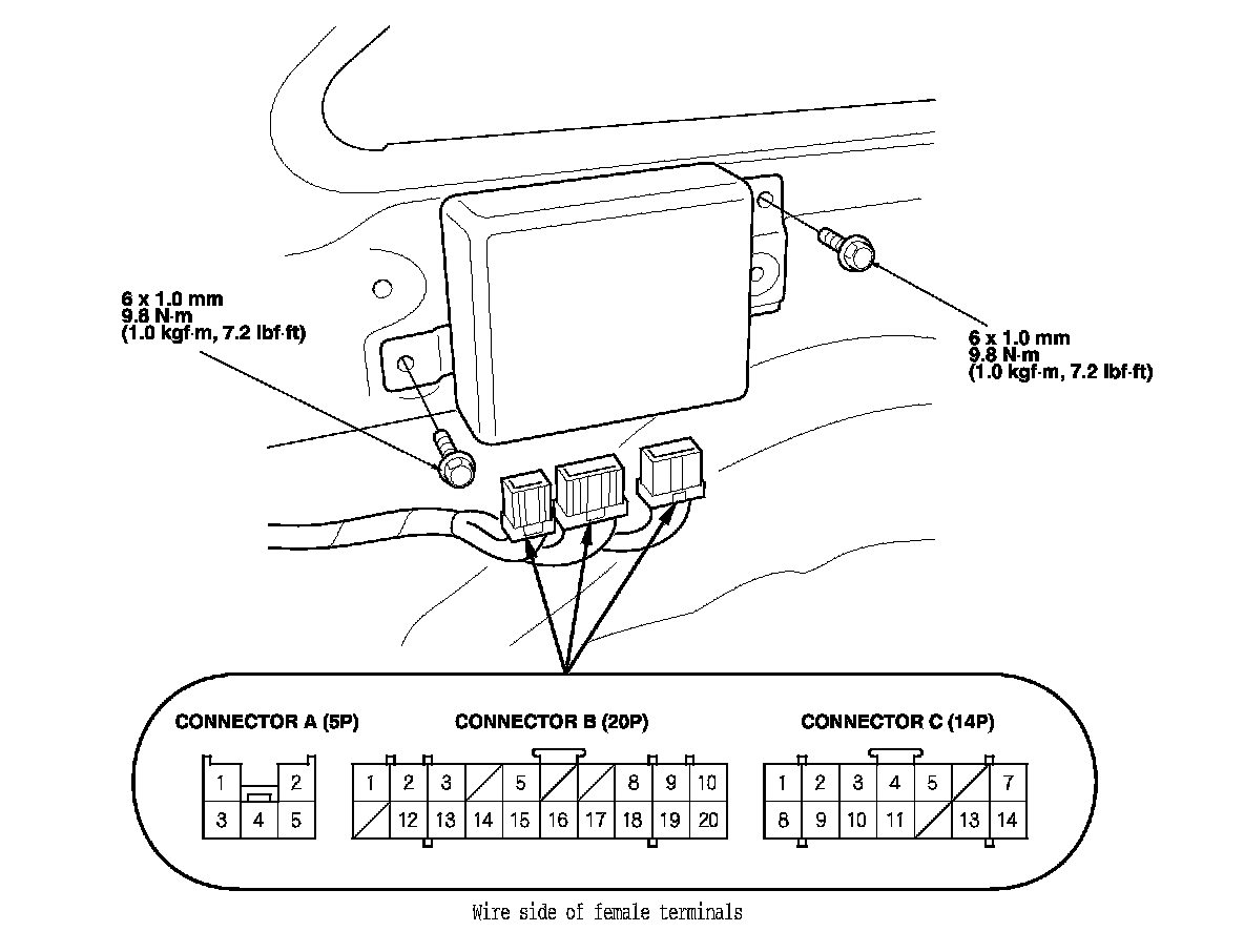 3. Disconnect power tailgate control unit connectors A (5P), B (20P), and C (14P).