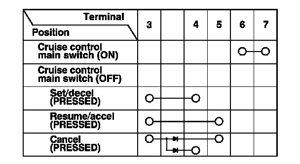 - If there is continuity, and it matches the table, but switch failure occurred on the cruise control input test, check and repair the wire harness on the switch circuit.