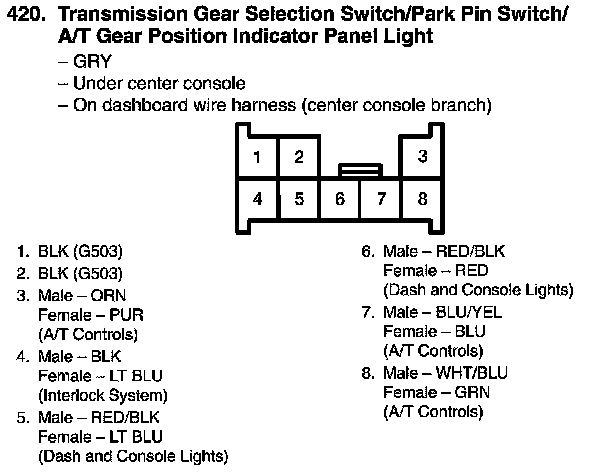 View 420 Transmission Gear Selection Switch/Park Pin Switch/A/T Gear Position Indicator Panel Light Connector View