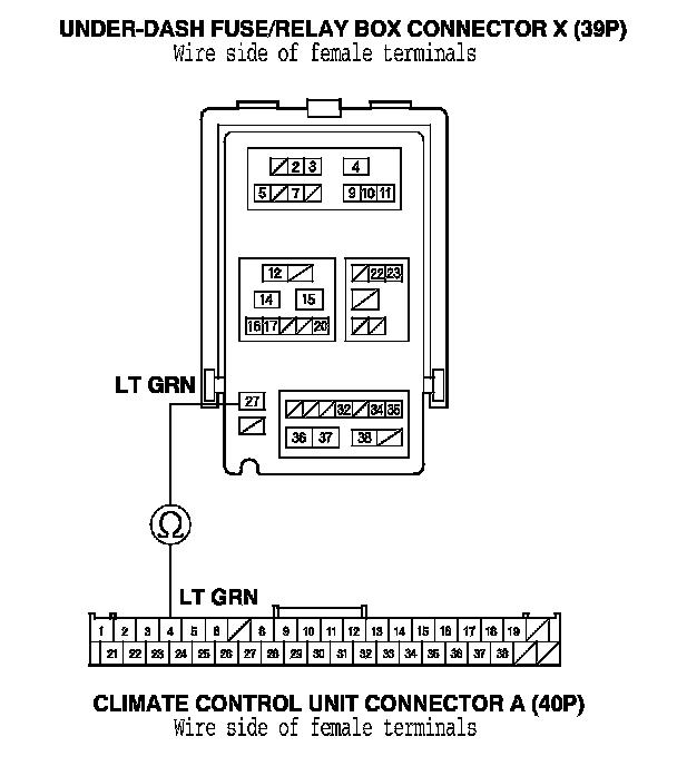 8. Check for continuity between under-dash fuse/relay box connector X (39P) terminal No. 27 and climate control unit connector A (40P) terminal No. 4.