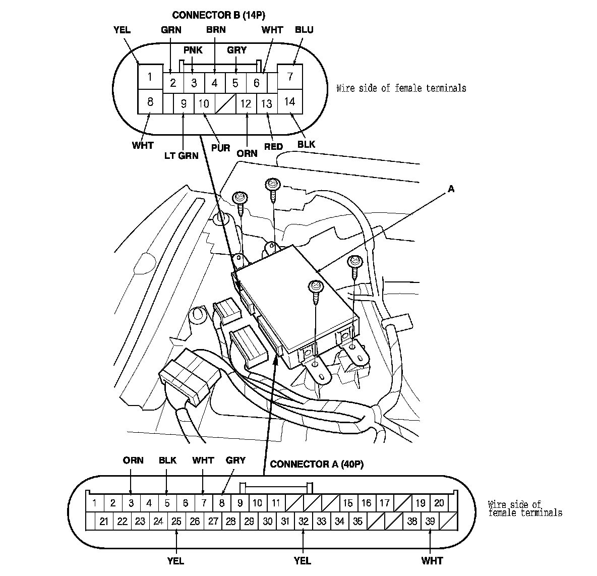 3. Disconnect driver's MPCS unit (A) connectors A (40P) and B (14P).
