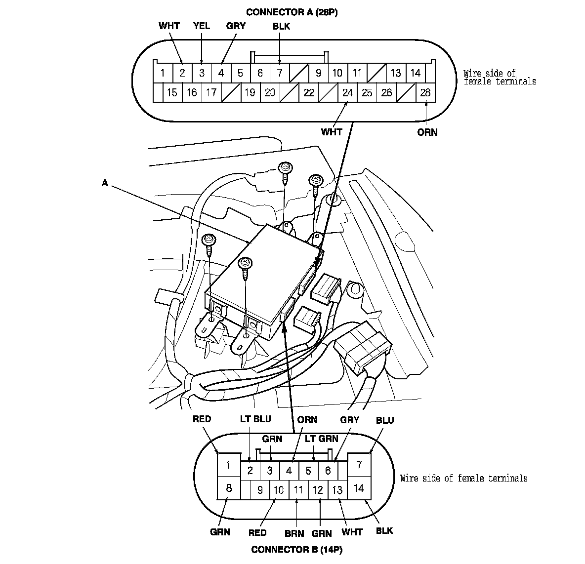 3. Disconnect front passenger's MPCS unit (A) connectors A (28P) and B (14P).