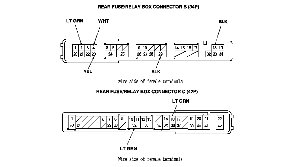 3. Disconnect rear fuse/relay box connectors B (34P) and C (42P).