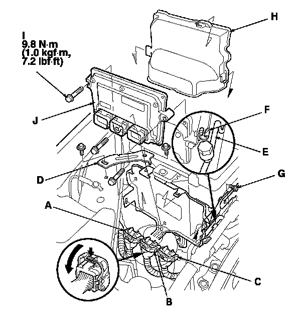 14. Remove the bolts (I), then remove the PCM (J).