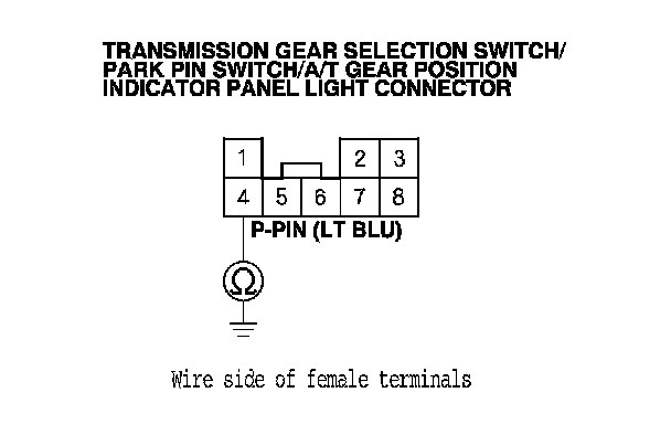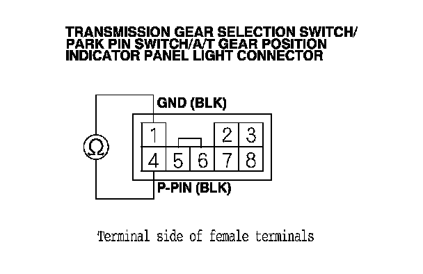 9. Check for continuity between transmission gear selection switch/park pin switch/A/T gear position indicator panel light connector terminal No. 4 and body ground.