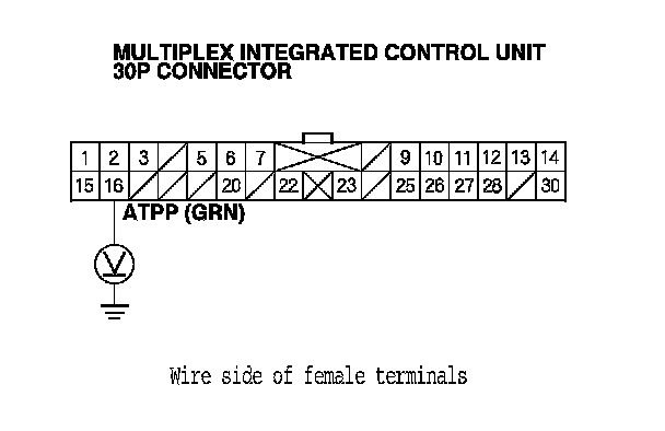 14. Measure the voltage between multiplex integrated control unit 30P connector terminal No. 16 and body ground.