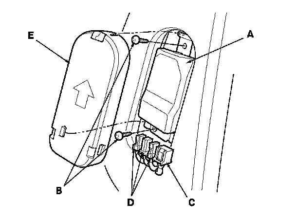 1. Place the new ODS unit (A) on the seat-back frame. Tighten the two screws (B), and connect the ODS unit harness 18P connector (C) and sensor connectors (D) to the ODS unit. Reinstall the cover (E).