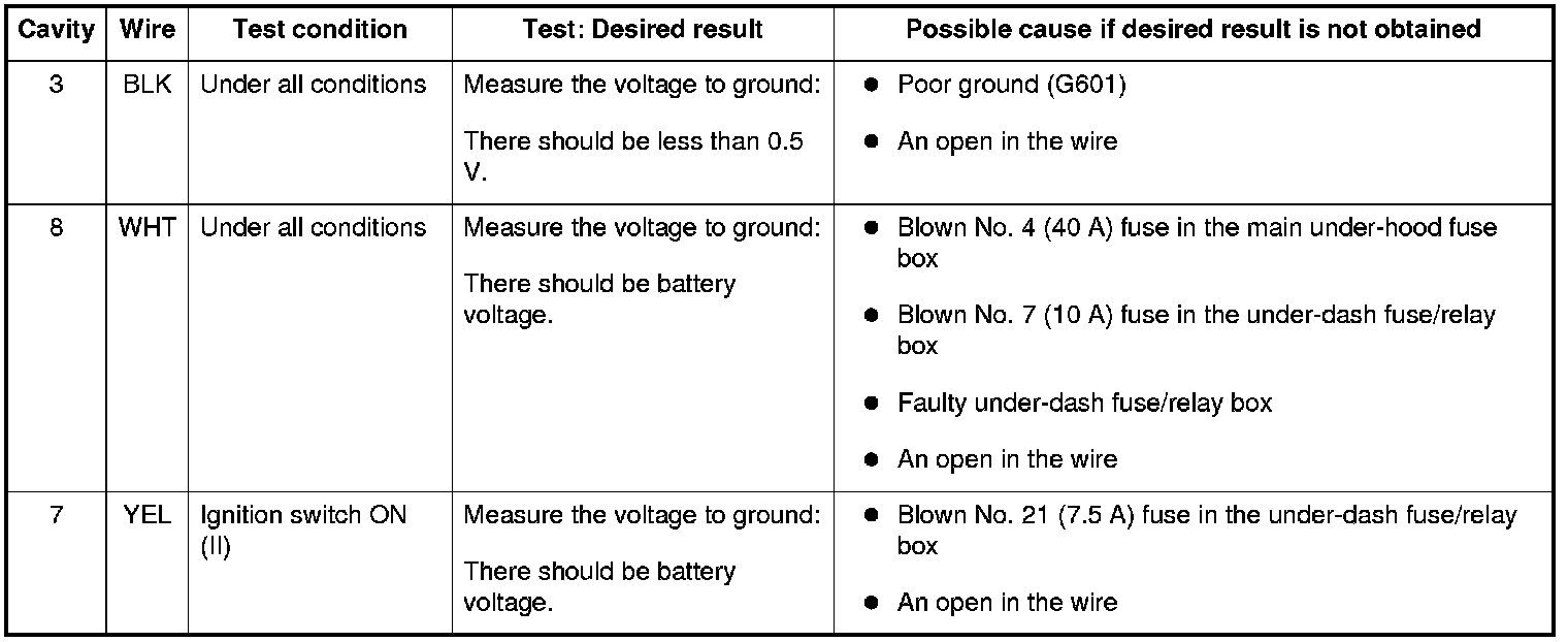 5. With the connector still disconnected, do these input tests at the following connector.