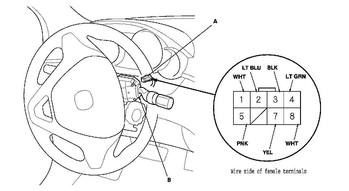 3. Disconnect the 8P connector (A) from the wiper/washer switch (B).