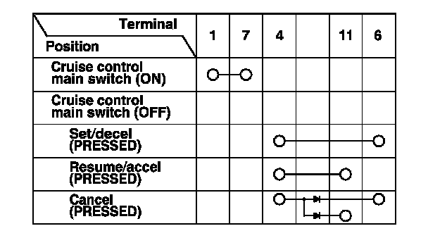 - If there is continuity, and it matches the table, but switch failure occurred on the cruise control input test, check and repair the wire harness on the switch circuit.