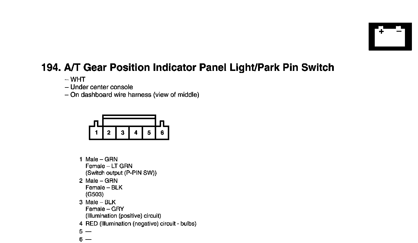 View 194 A/T Gear Position Indicator Panel Light/Park Pin Switch Connector View