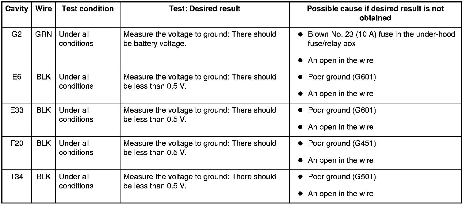 6. Reconnect the connectors to the under-dash fuse/relay box, and do these input tests at the following connectors.