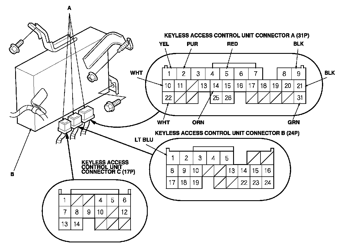 6. Reconnect the connectors to the keyless access control unit, and do these input tests at the connectors.