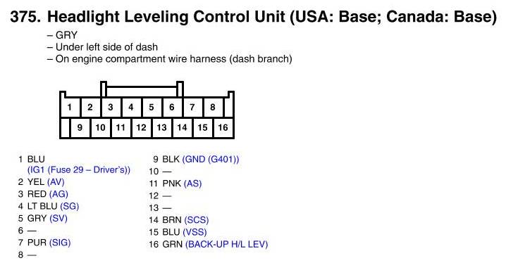 View 375 - Headlight Leveling Control Unit Connector View (USA: Base; Canada: Base)