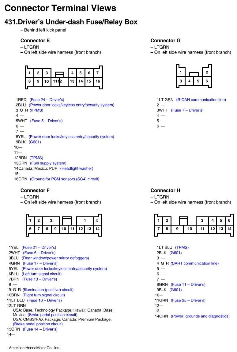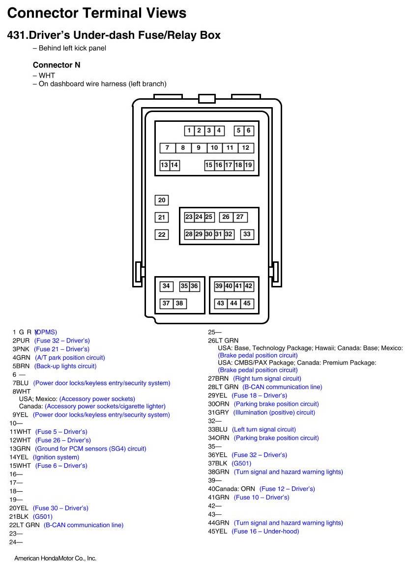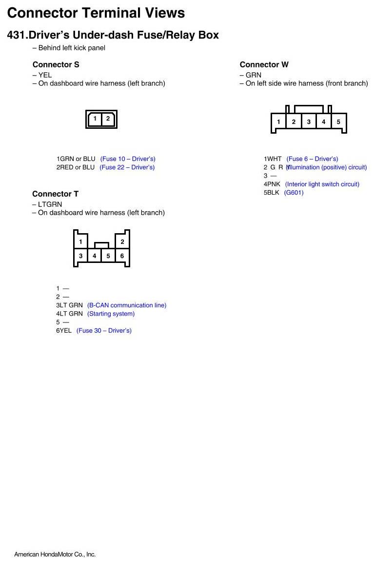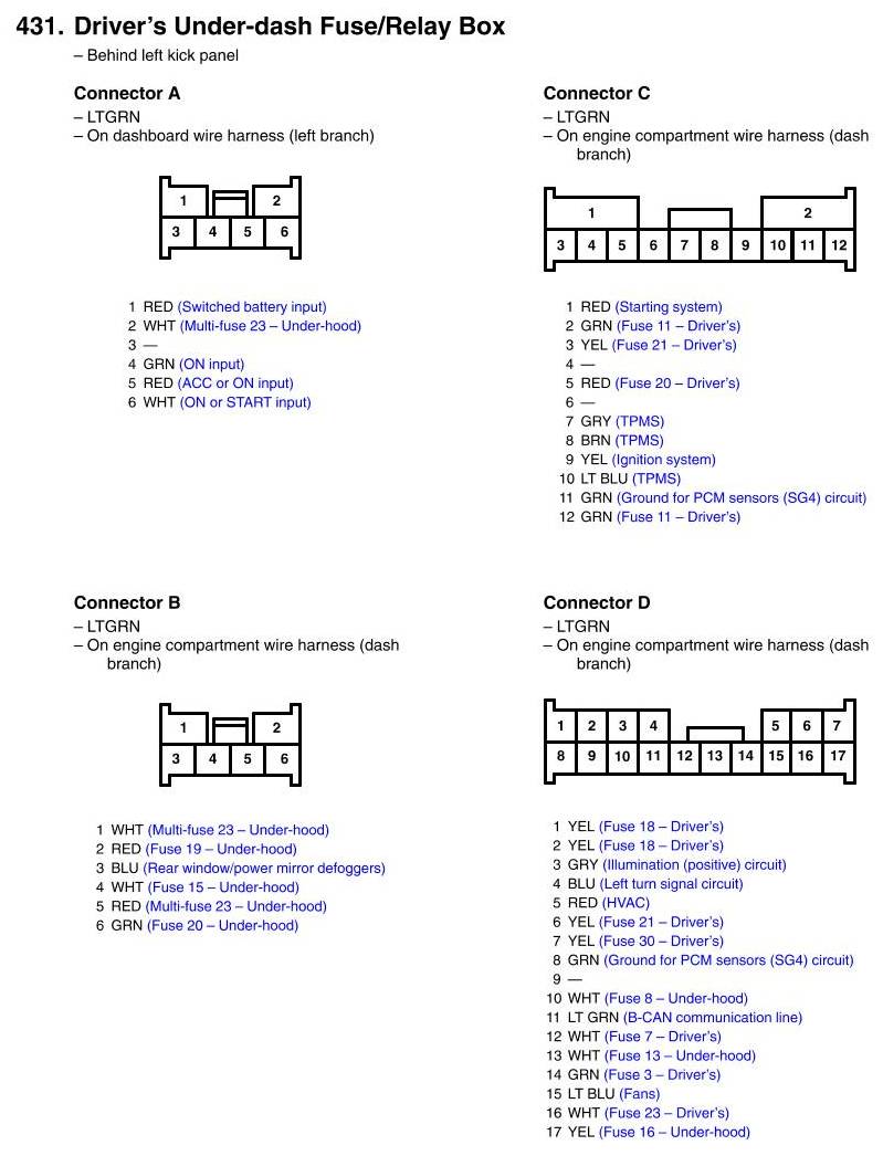 View 431 - Driver's Under-dash Fuse/Relay Box Connector View