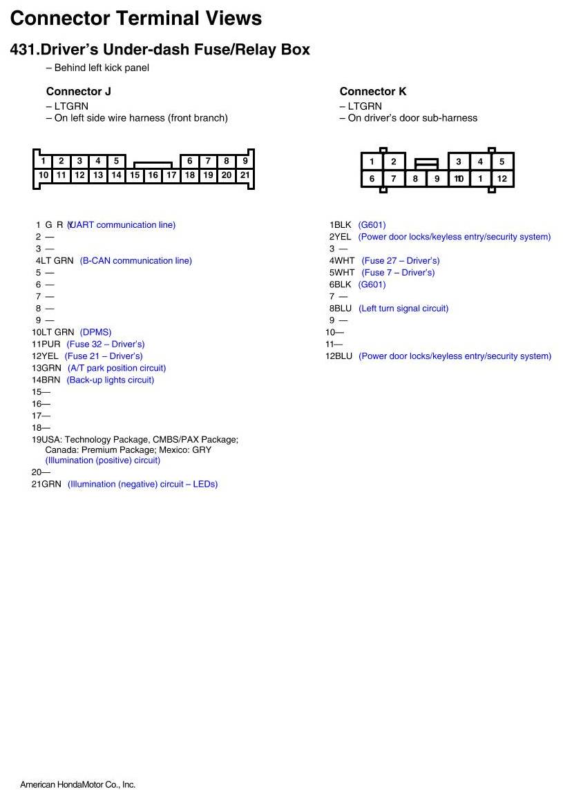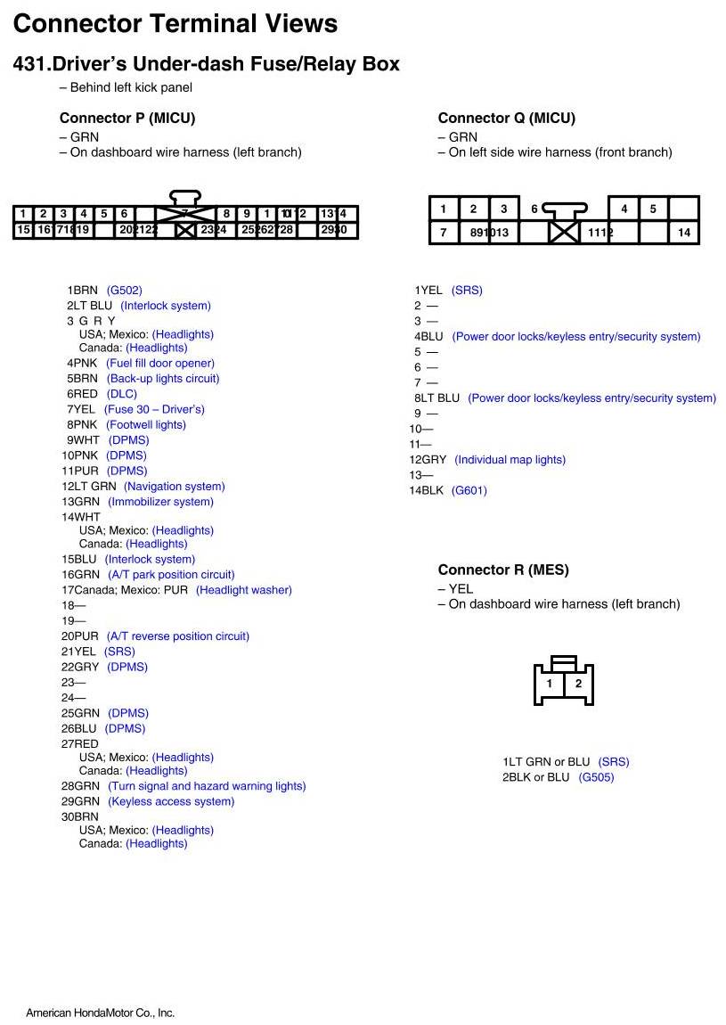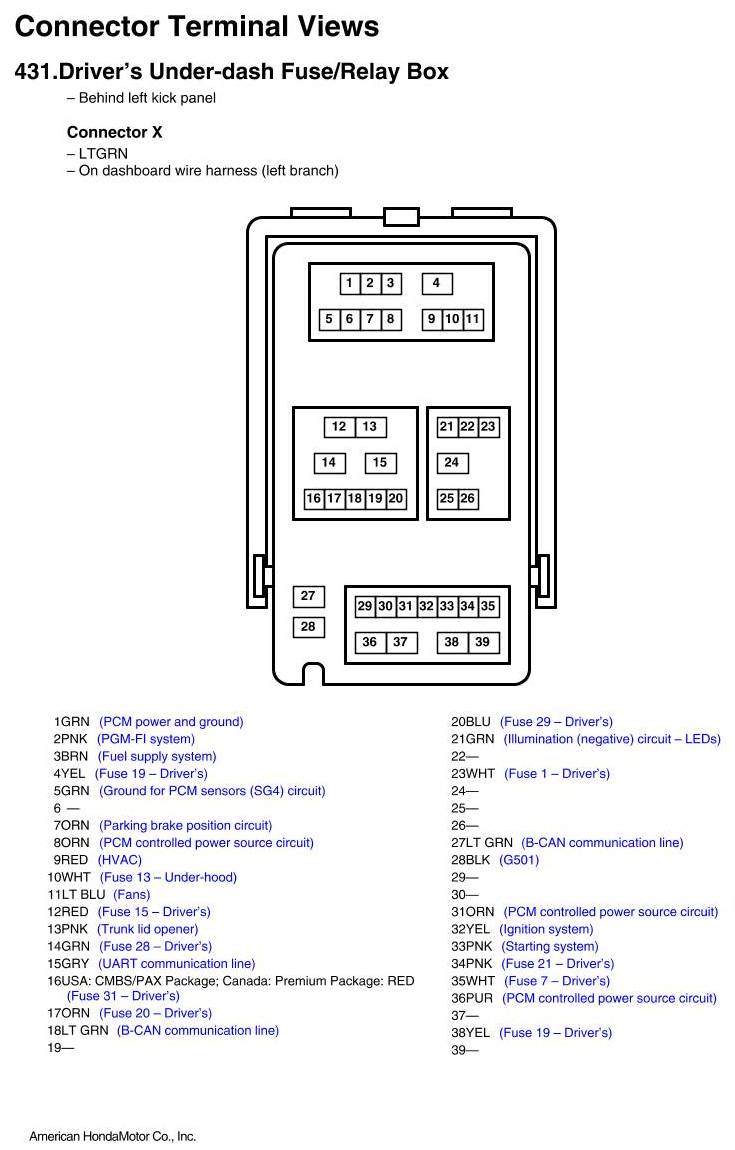 View 431 - Driver's Under-dash Fuse/Relay Box Connector View