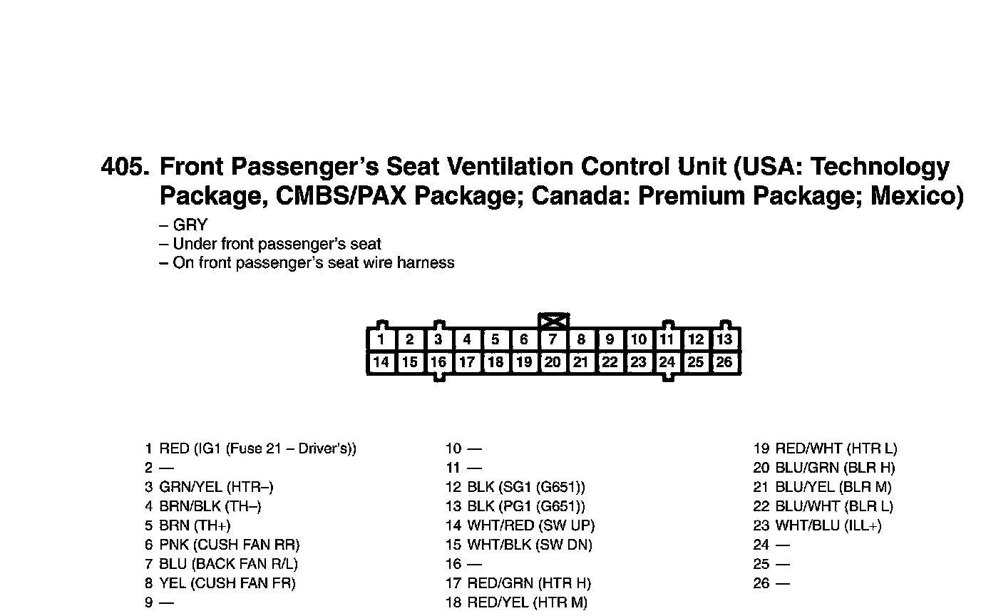 Front Passenger's Seat Ventilation Control Unit Connector View (USA: Technology Package, CMBS/PAX Package)