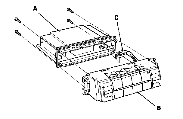 4. Remove the self-tapping screws, then carefully separate the climate control unit (A) from the climate control panel (B). Disconnect the connector (C) from the climate control unit. Do not kink or pull on the wires between the control panel and the control unit. Do not touch the electronic components on the printed circuit board in the control unit and the control panel.