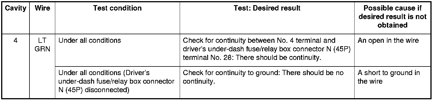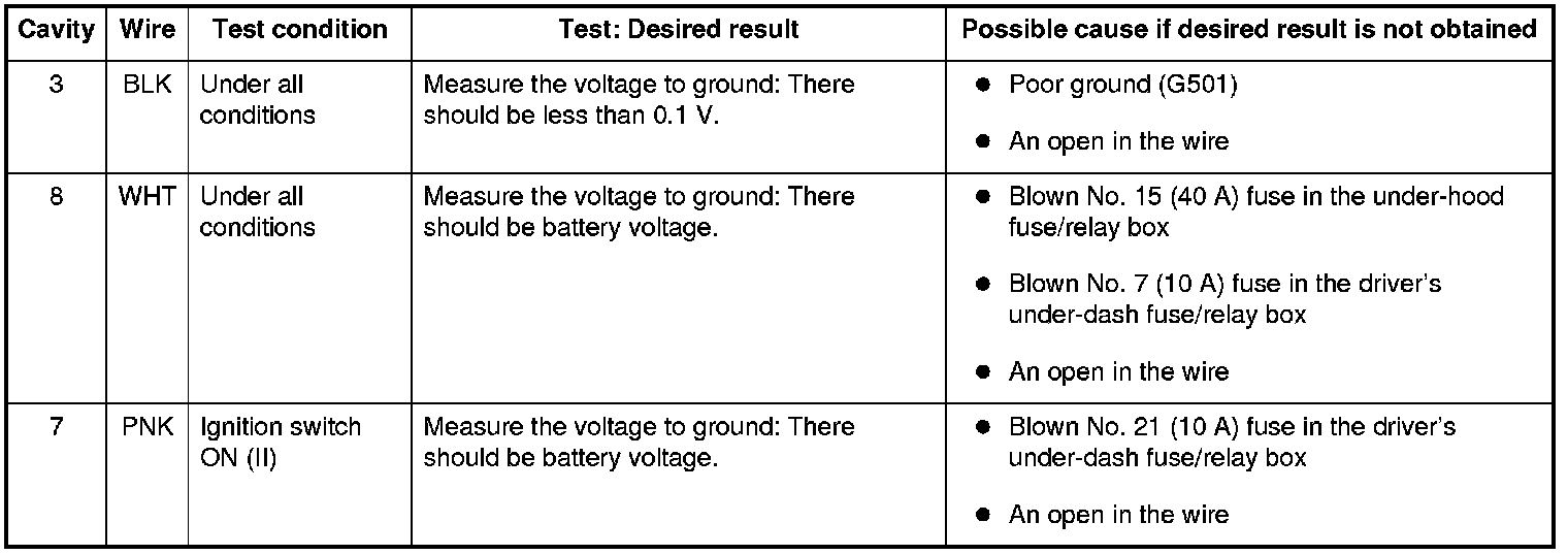 4. Reconnect the connector to the wiper/washer switch, and make these input tests at the connector.