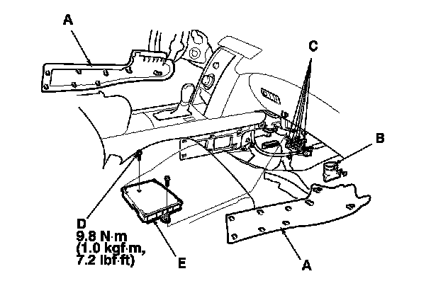 10. Remove the front console covers (A), Center Console Removal/Installation and pull back the carpet.
