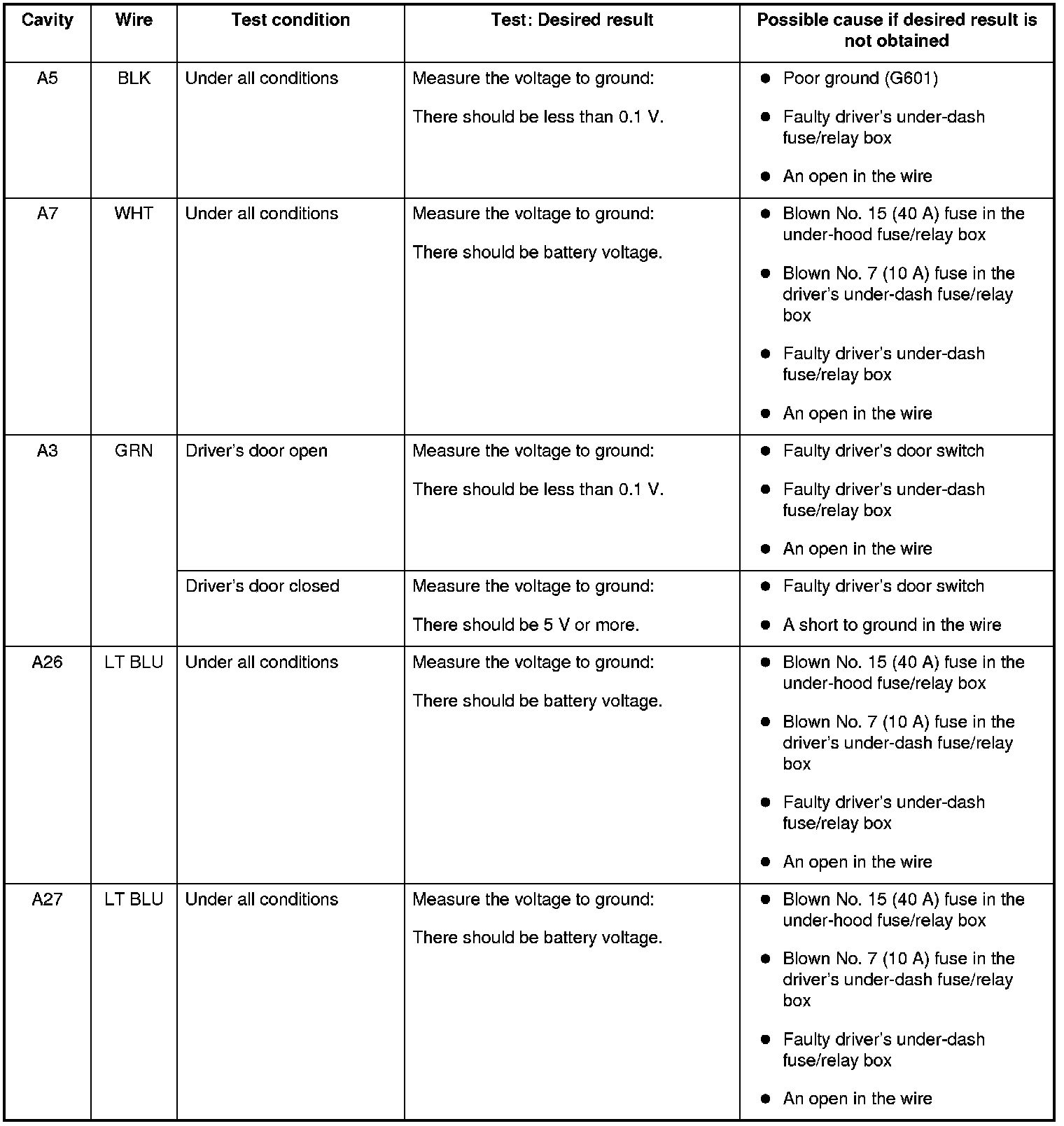 - If all the input tests prove OK, the control unit must be faulty; replace the driver's MPCS unit and go to step 7.