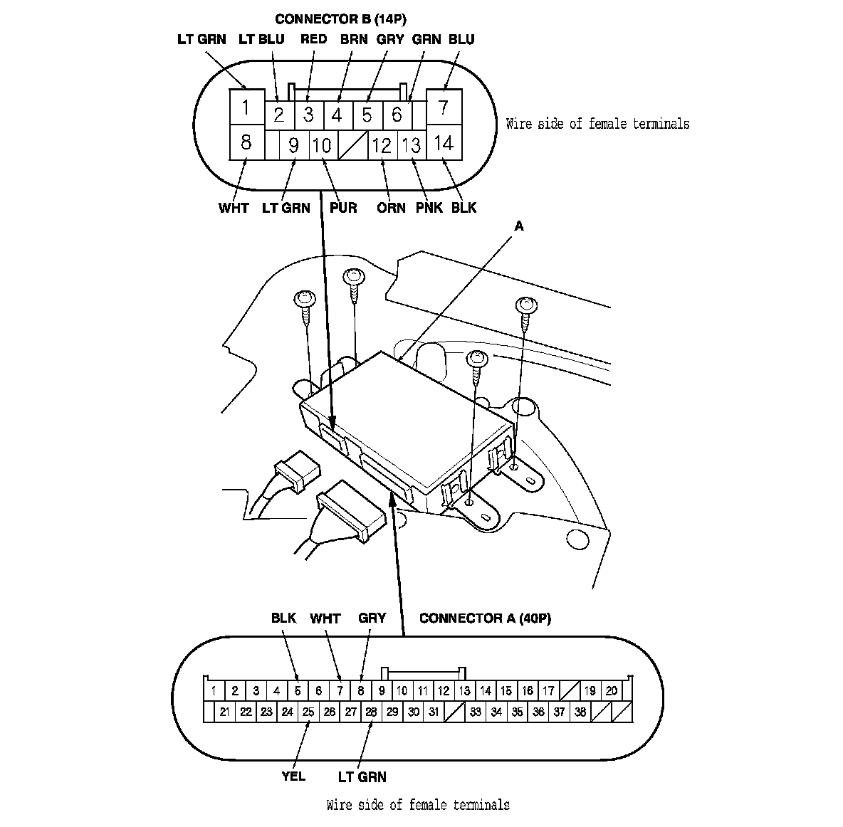 3. Disconnect driver's MPCS unit (A) connectors A (40P) and B (14P).