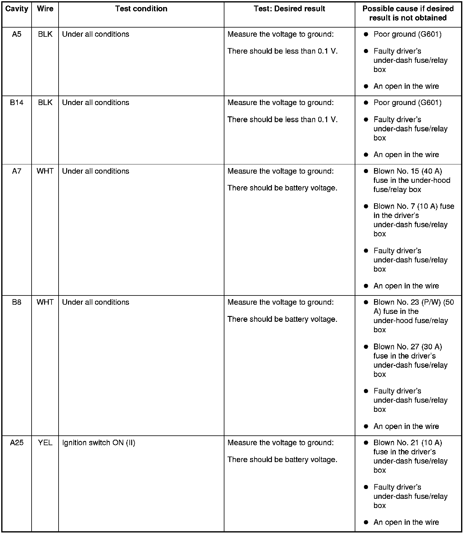 - If all the input tests prove OK, the control unit must be faulty; replace the driver's MPCS unit and go to step 7.
