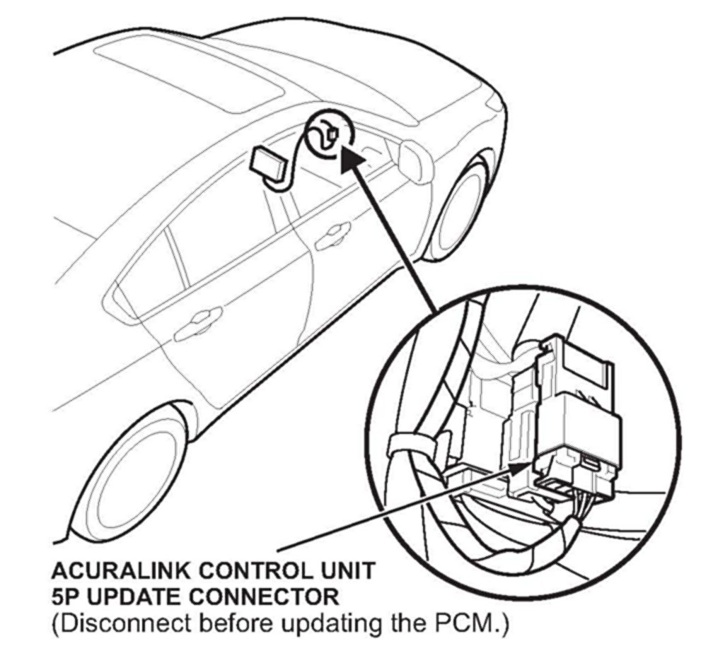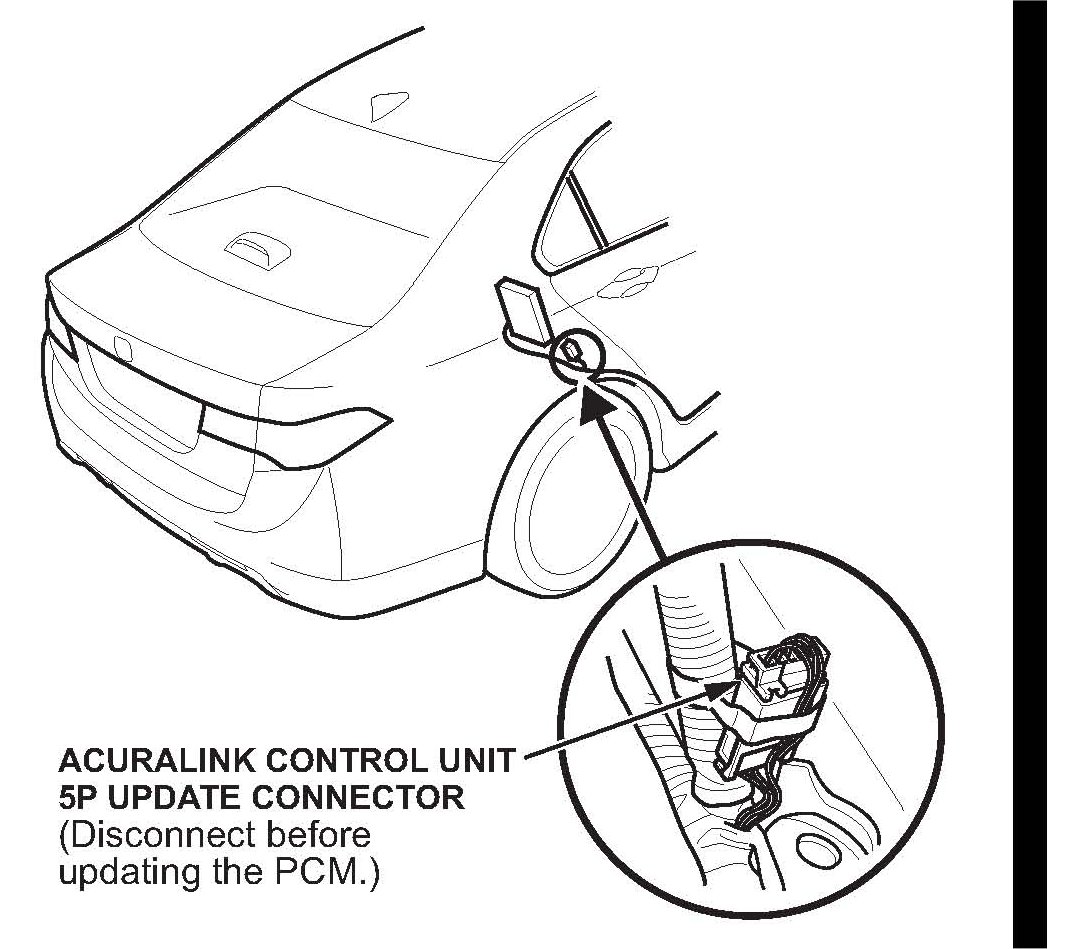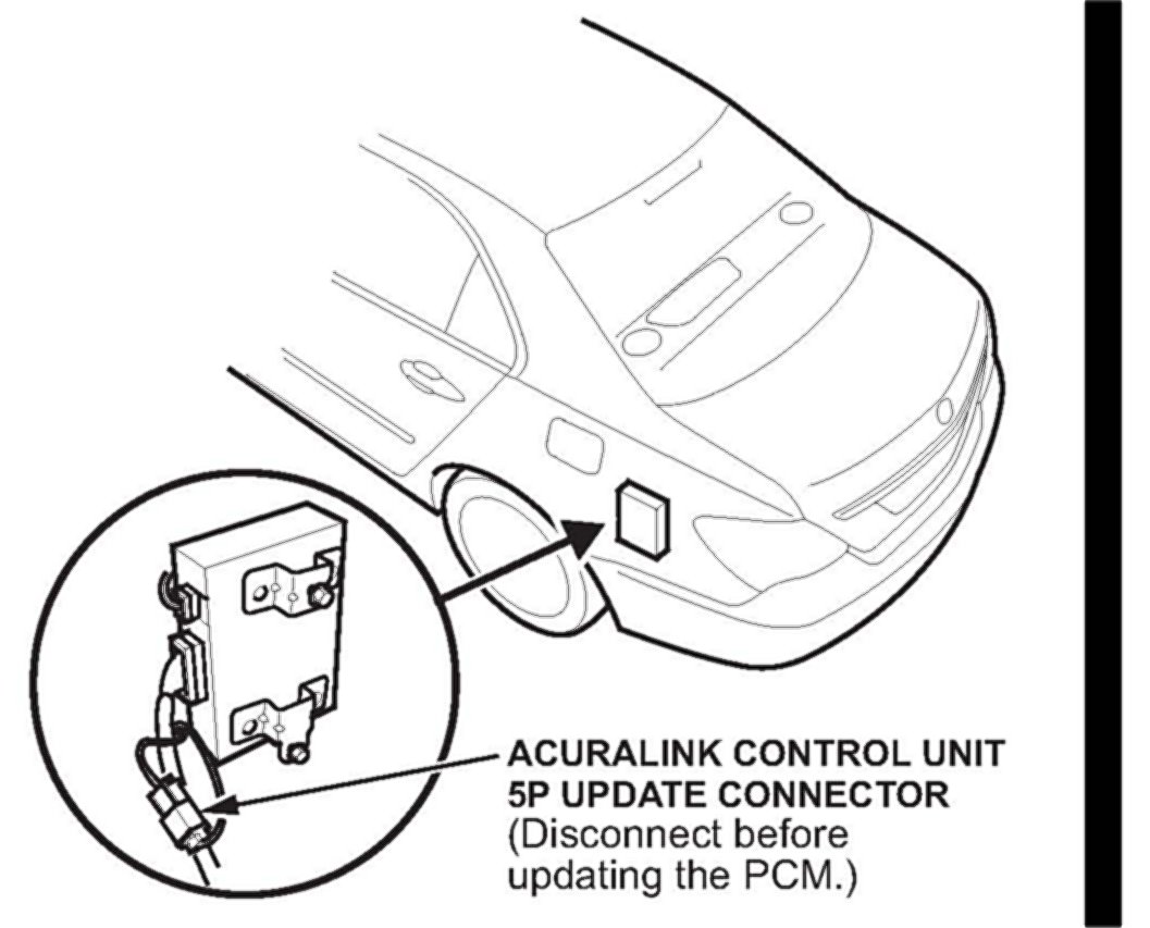 *On some 2009 RLs, TLs, and TSXs with Tech Package (see VEHICLES AFFECTED), an AcuraLink control unit (XM receiver) communication error requires that you disconnect the AcuraLink control unit 5P update connector before doing a PCM update. If the AcuraLink update connector is not disconnected, the PCM may not accept the update, or the engine may not start after the update. To correct either of these problems, disconnect the AcuraLink update connector, and redo the update.*