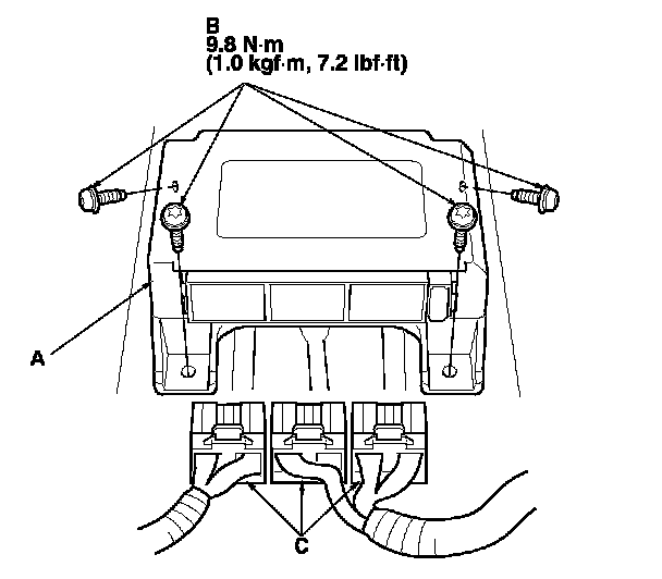1. Install the new SRS unit (A) with the TORX bolts (B), then connect the connectors (C) to the SRS unit; push them into position until they click.