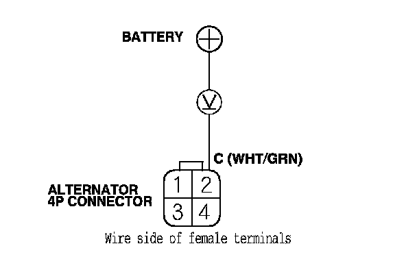 7. Measure the voltage between alternator 4P connector terminal No. 2 and the positive terminal of the battery.