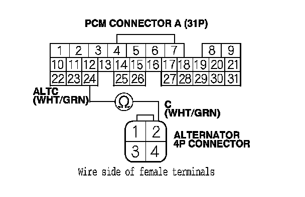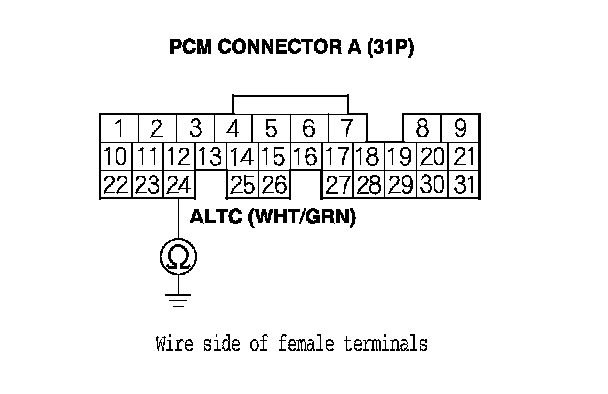 13. Check for continuity between PCM connector terminal A24 and alternator 4P connector terminal No. 2.