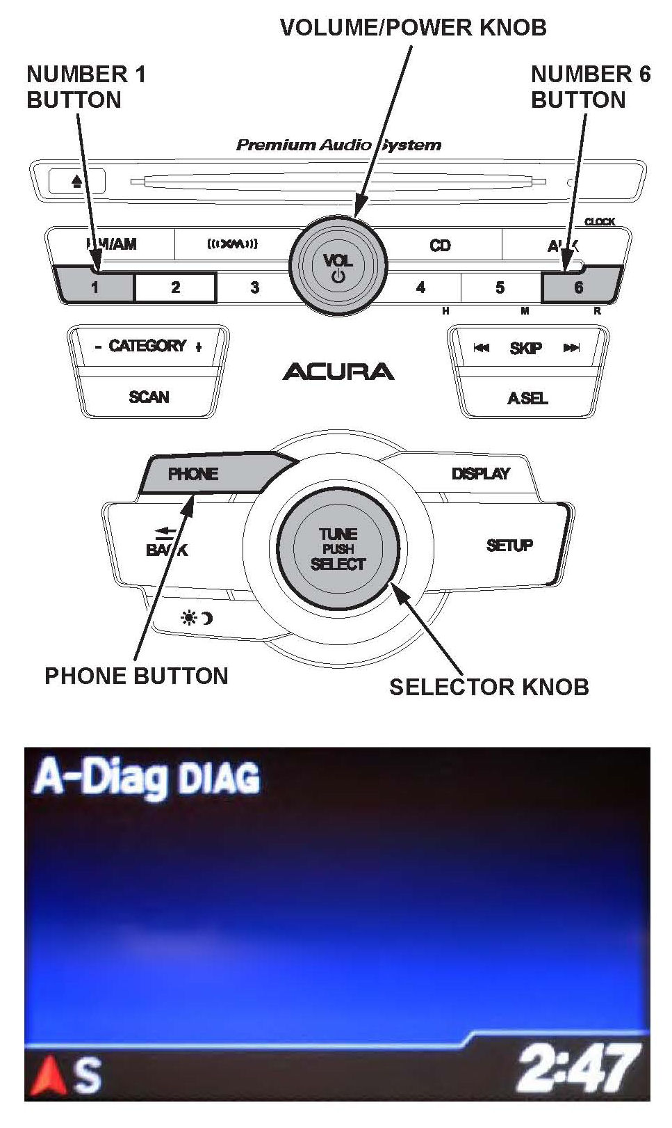 3. Press and hold the audio preset No.1 button, then press and hold the audio preset No.6 button. Press and hold the Volume/Power knob. Release the buttons and the knob once the audio unit enters into the self-diagnosis mode and the "A-Diag DIAG" screen appears.
