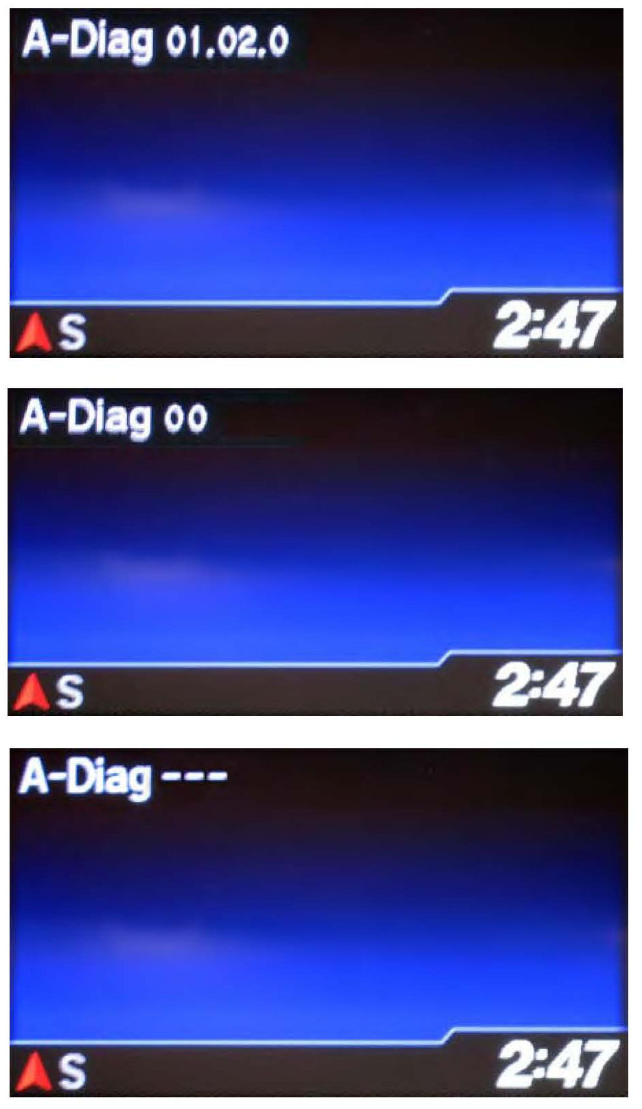 The first "A-Diag" screen displays the first five digits of the software version. Press the No.2 button to see the last two digits.