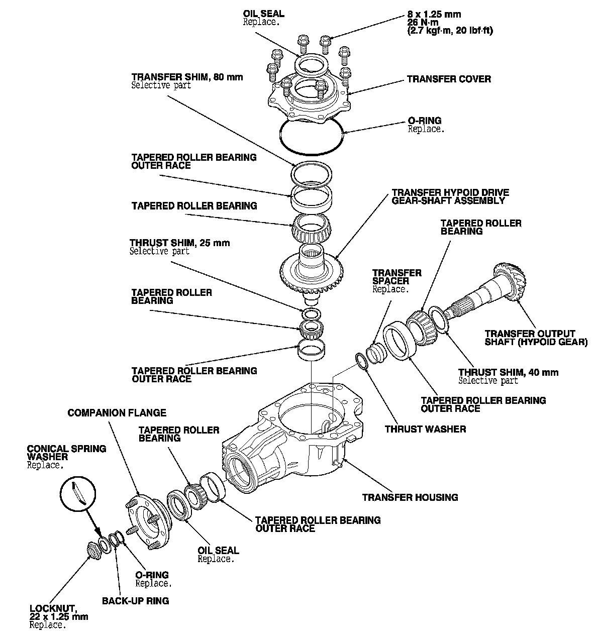 2. Remove the transfer hypoid drive gear/shaft assembly (C), 25 mm thrust shim (D), and tapered roller bearing (E).