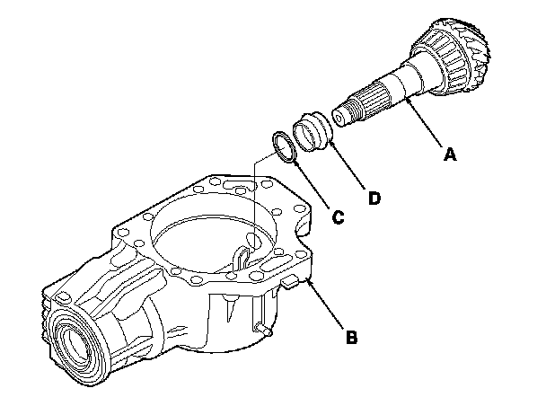 10. Remove the transfer output shaft (hypoid gear) (A) from the transfer housing (B), then remove the thrust washer (C) and transfer spacer (D) from the transfer output shaft (hypoid gear).