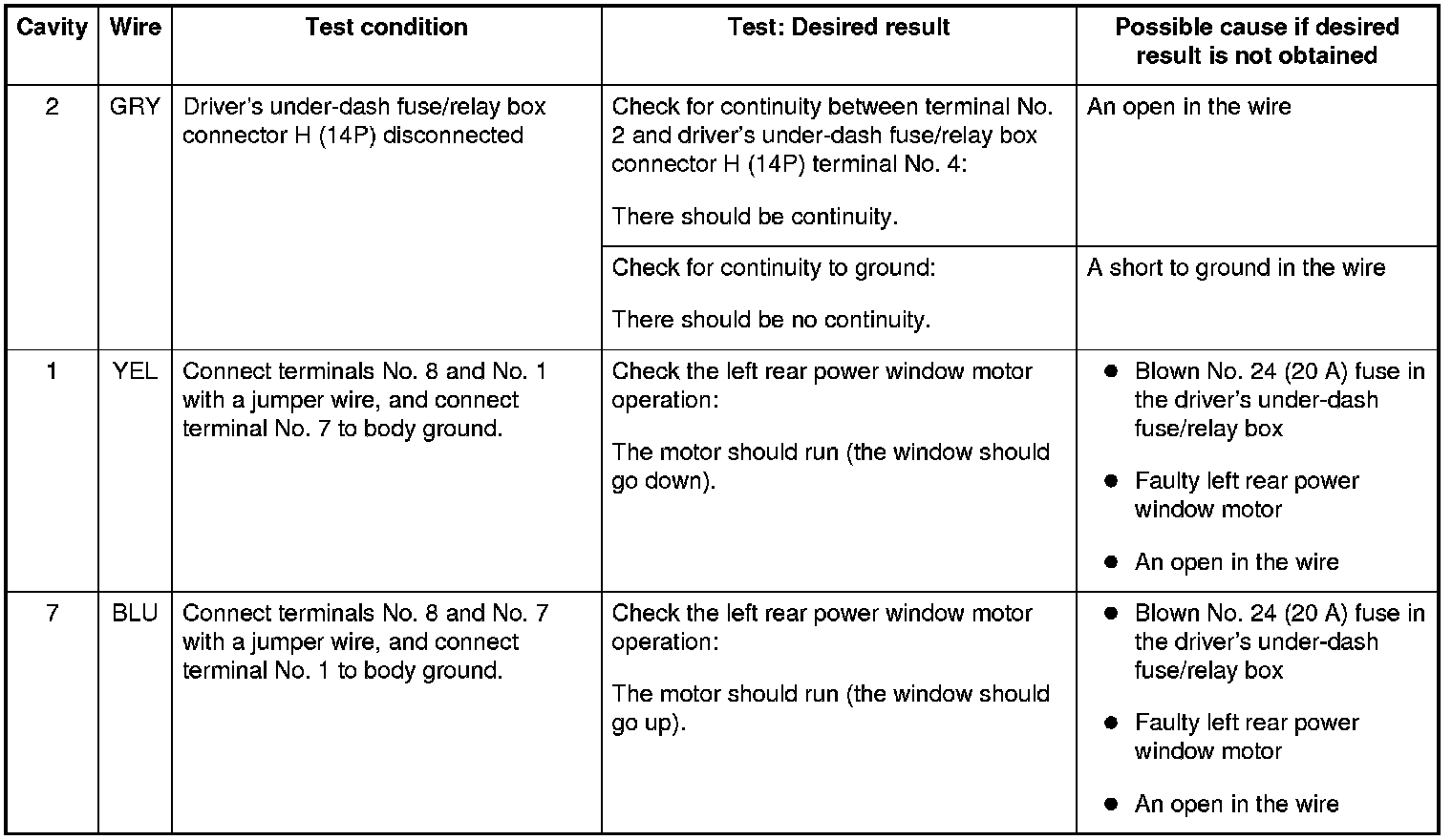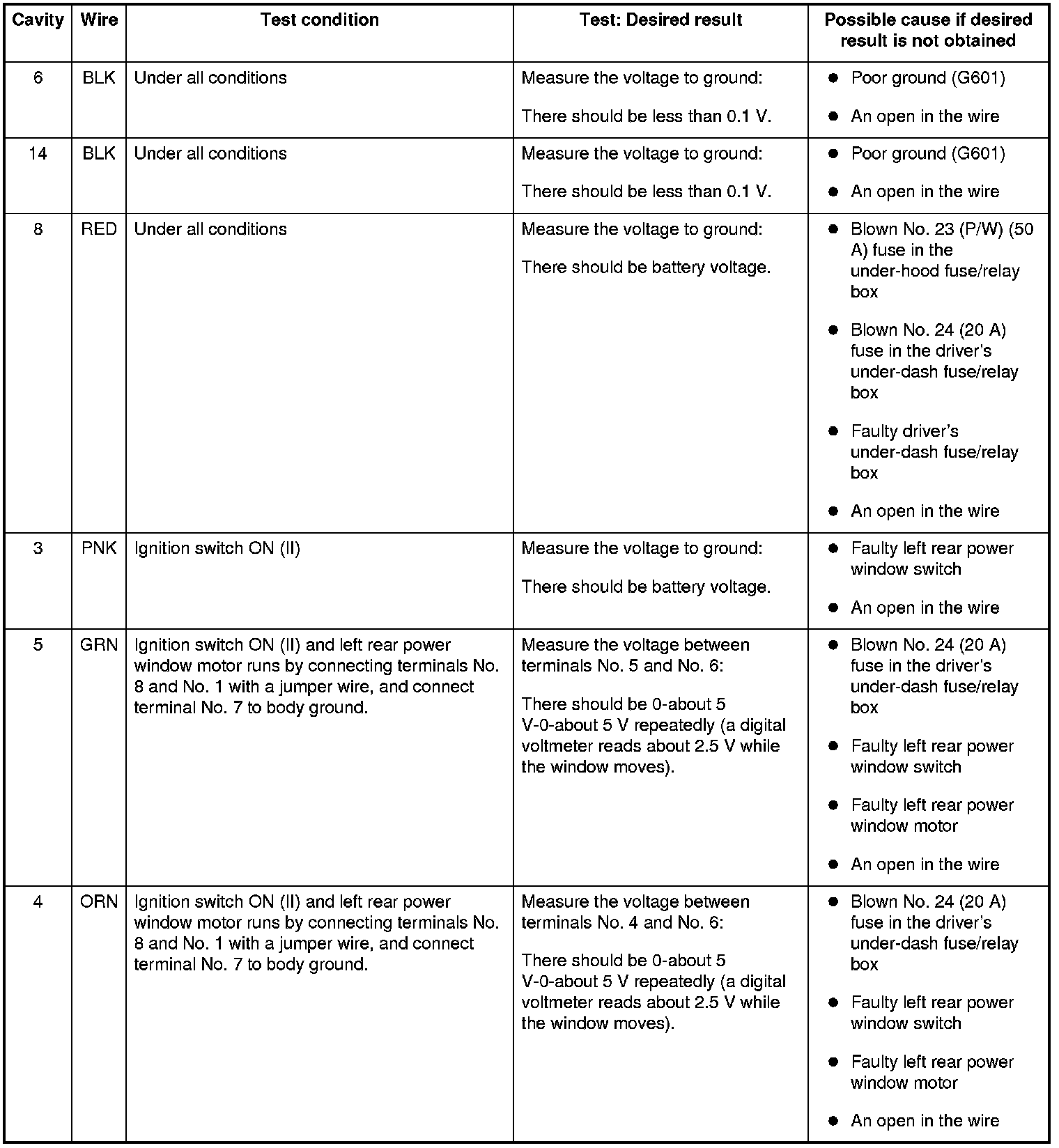6. Reconnect the connector to the left rear power window switch, and do these input tests at the connector.