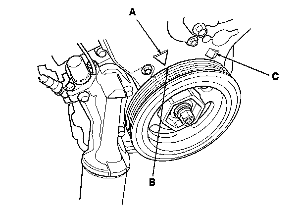 10. Aim the light toward the pointer (A) on the timing belt cover. Check the ignition timing under a no load condition (headlights, blower fan, rear window defogger, and air conditioner are turned off).