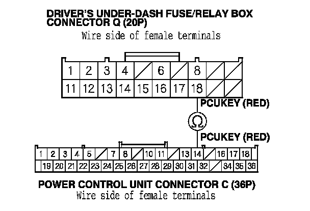 10. Check for continuity between driver's under-dash fuse/relay box connector Q (20P) terminal No. 18 and power control unit connector C (36P) terminal No. 14.