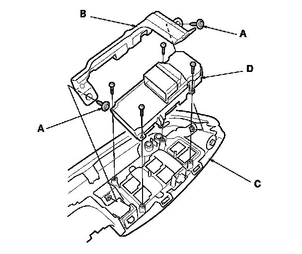 2. Remove the two screws (A), then remove the bracket (B) from the armrest assembly (C).