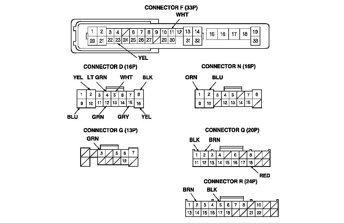 3. Disconnect driver's under-dash fuse/relay box connectors D, F, G, N, Q, and R.