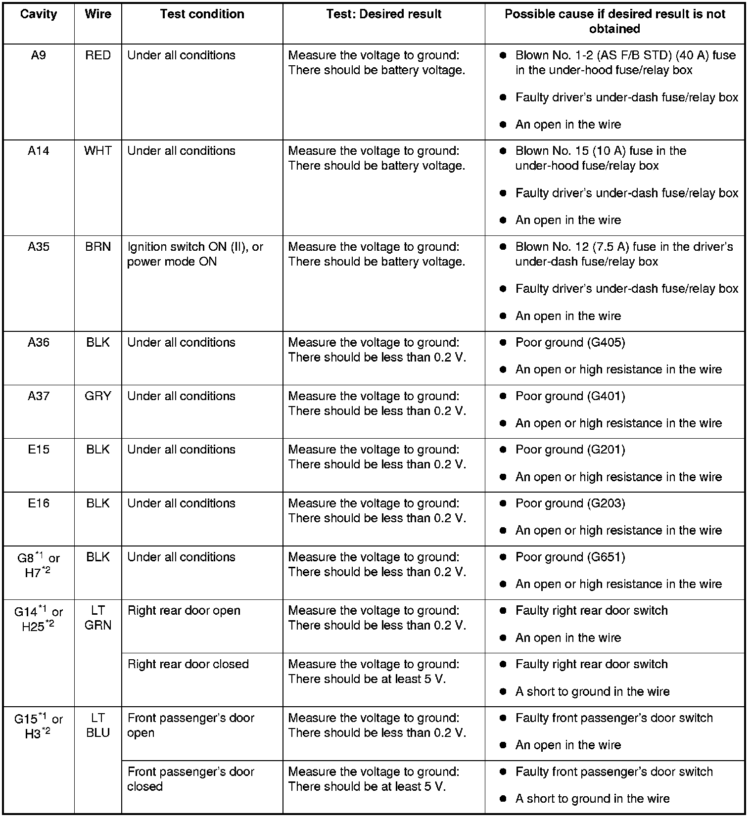 6. Reconnect the connectors to the driver's under-dash fuse/relay box, and do these input tests at the following connectors.