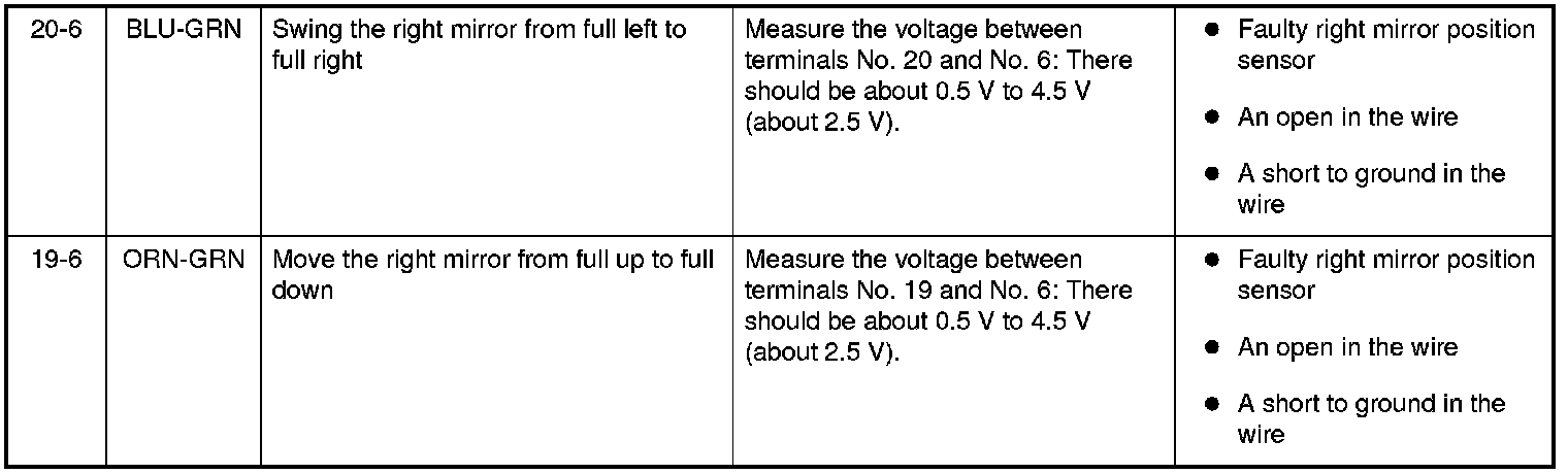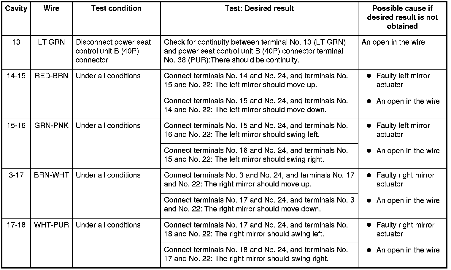 5. Reconnect the connector to the power mirror control unit, and do these input tests at the following connector.