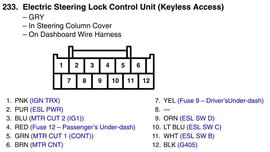 View 233 - Electric Steering Lock Control Unit Connector View (Keyless Access)