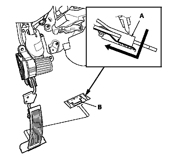 1. Install the accelerator pedal pad (A) to the pedal stop (B). Slide the pad until it locks with a clicking sound.