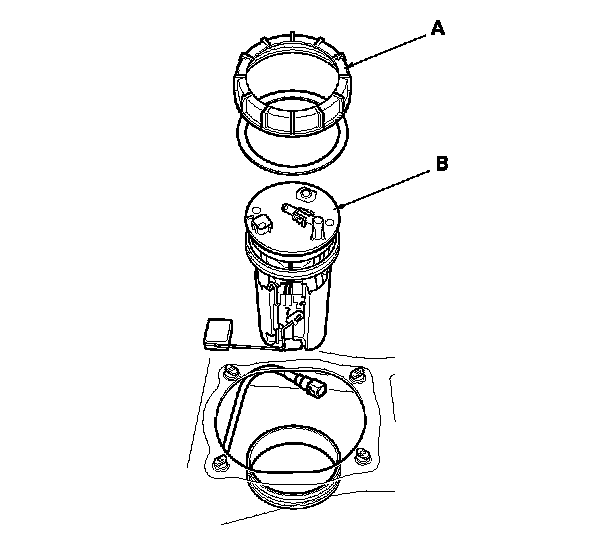 7. Remove the locknut (A) and the fuel tank unit (B).