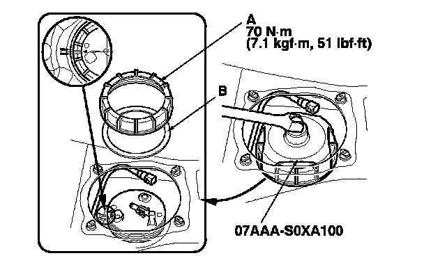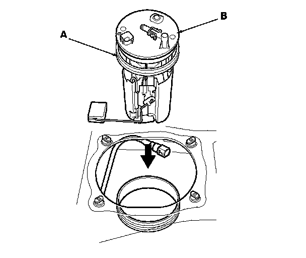 1. Temporarily attach a new base gasket (A) to the fuel tank unit (B), then insert the fuel tank unit partially into the fuel tank.