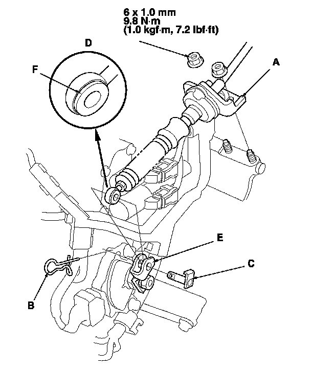 5. Remove the spring clip (B) and the control pin (C), then separate the shift cable end (D) from the selector control lever (E).