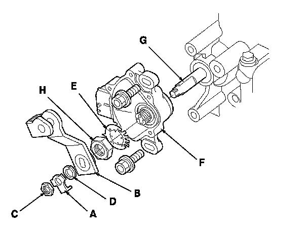 9. Pry the lock tabs of the lock washer (E) on the transmission range switch (F), hold the selector control shaft (G) with a 6.0 mm wrench, and loosen the locknut (H).