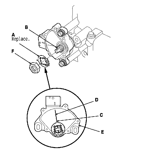 14. Install a new lock washer (A) over the selector control shaft (B) while aligning the indicator tab (C) of the lock washer with the N positioning line (D) on the transmission range switch (E), and install the locknut (F).