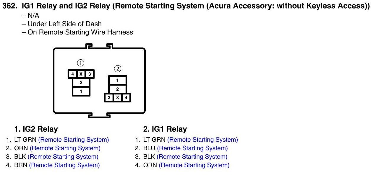 IG1 Relay and IG2 Relay Connector View (Remote Starting System (Acura Accessory: without Keyless Access))
